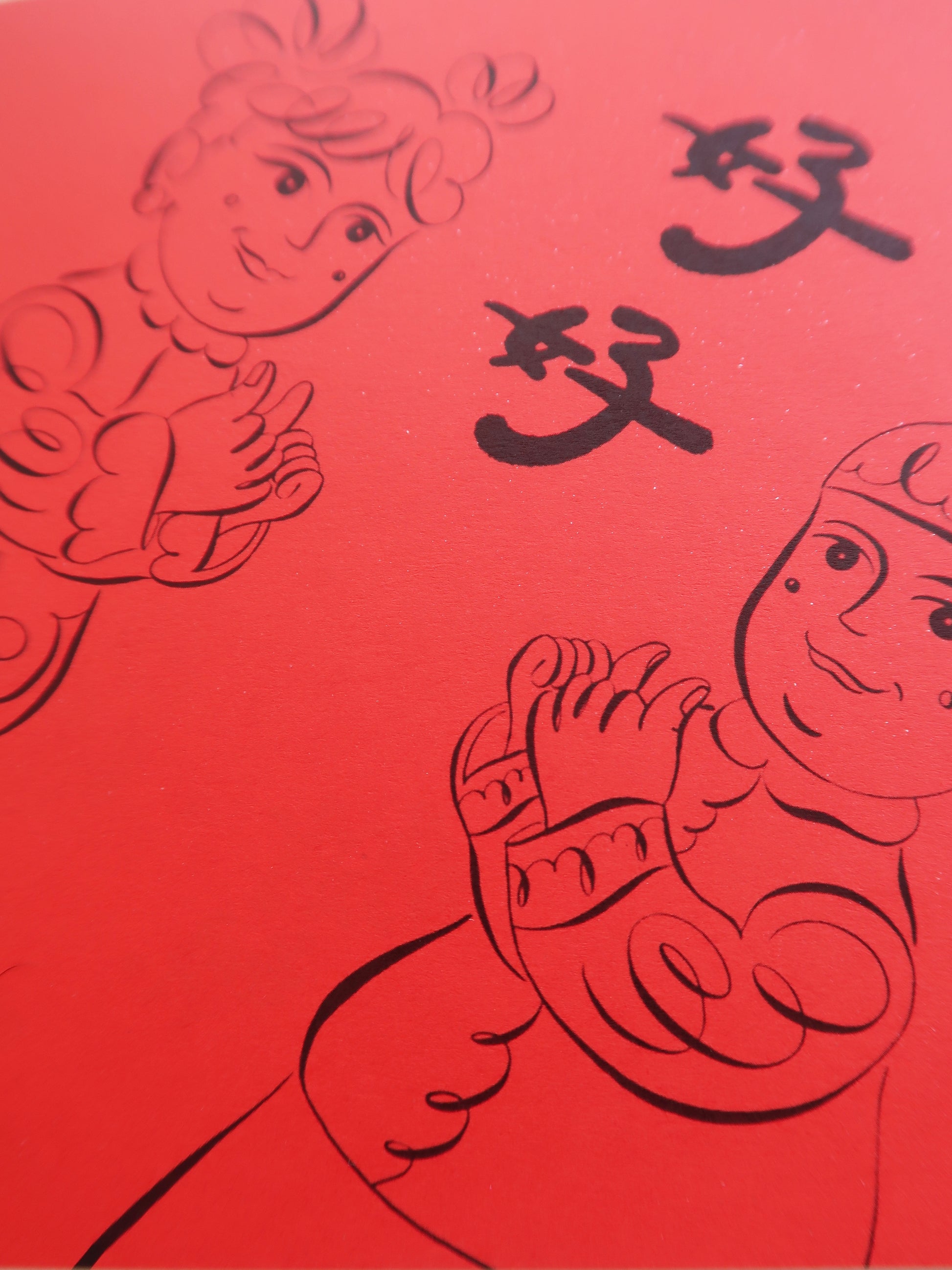 This Fai Chun is a mixture of Ornamental Calligraphy and Chinese culture with Golden Boy and Jade Girl giving thumbs ups and the chinese character is 好好 pronouncing as Ho Ho which means "Good".