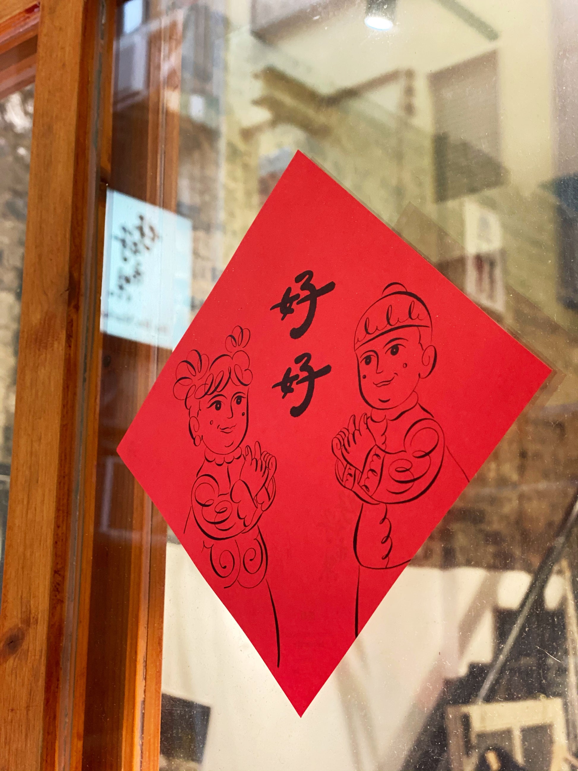 運用優雅俐落的線條,畫出極具濃厚西方氣息的金童玉女,肥嘟嘟的雙手比讚,再由店主肥嘟嘟的手中,寫出「好好」兩字,在衝突中找到良好的平衡點,融合出另一種中西書法美。